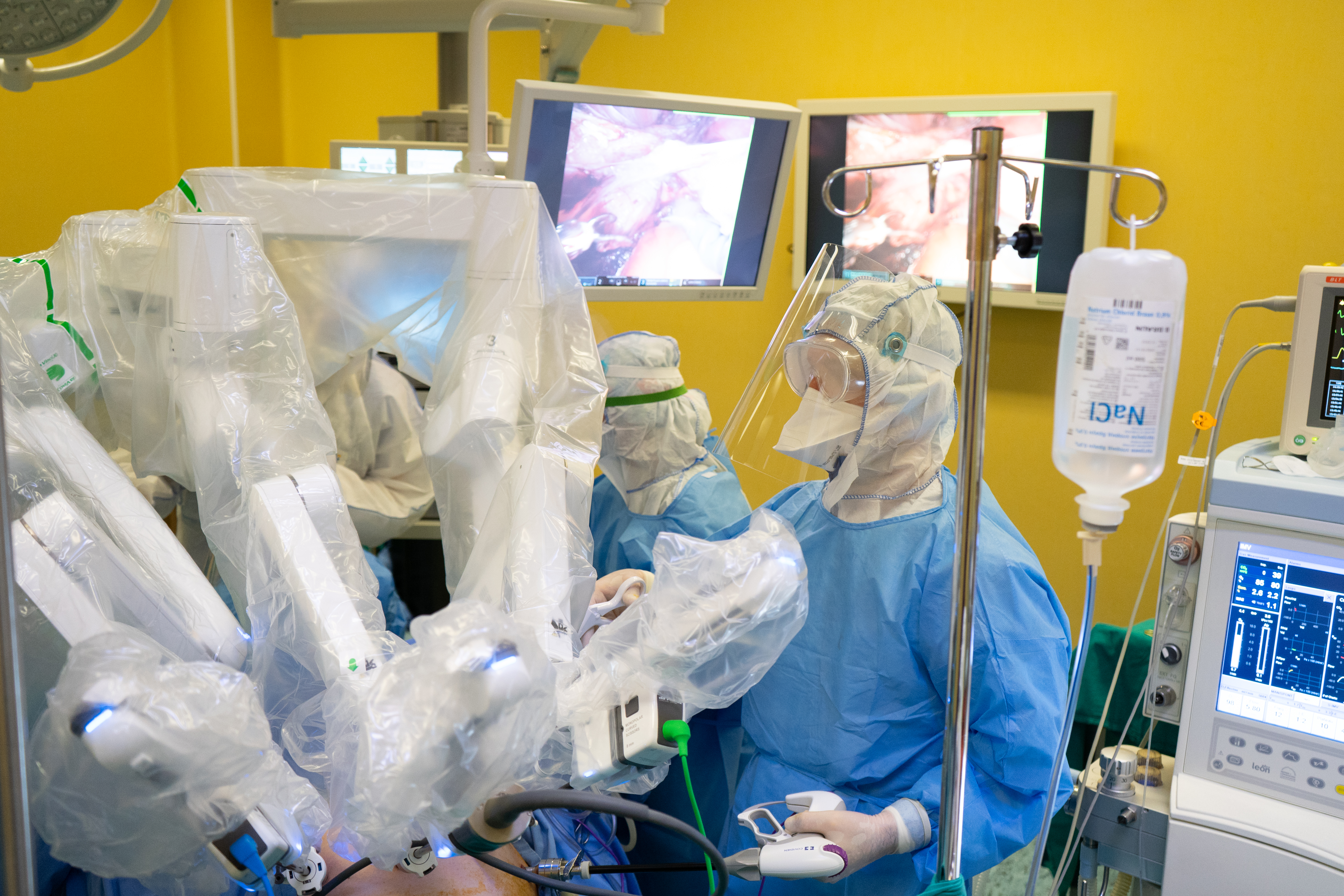 За тази цел в УМБАЛ „Света Марина“ – Плевен, се проведоха няколко симулационни обучения по време на робот-асистирани операции за поведение на здравните специалисти при лечение на пациенти с наличие на симптоми или доказан коронавирус. Екипите от лекари и медицински сестри тренираха поставянето на специално предпазно облекло и режим на работа в среда с COVID-19.