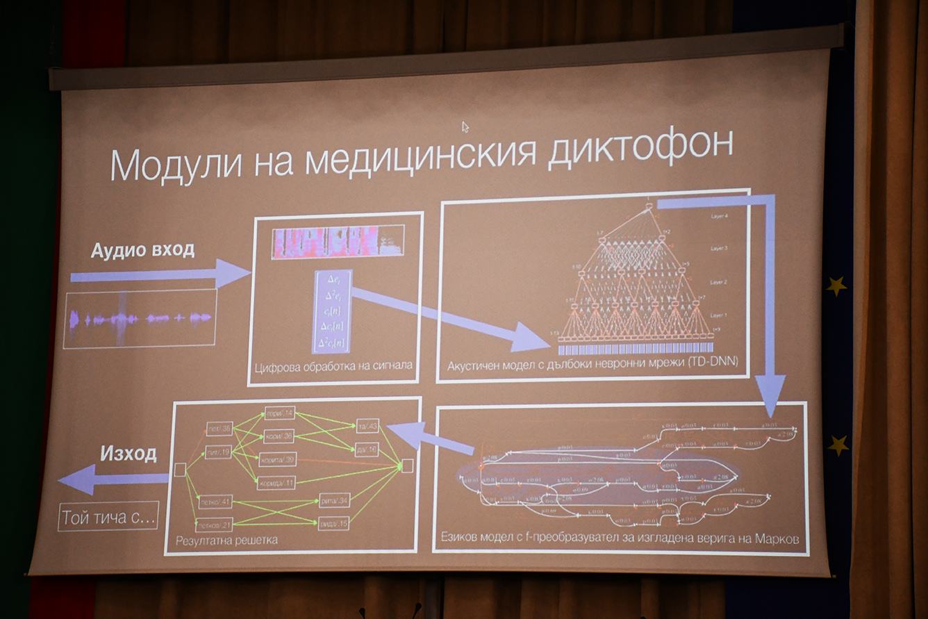 Проф. Михов демонстрира и прототипи на системи за разпознаване на българска реч за медицински цели (медицински диктофон), както и за административни нужди (интелигентен стенограф). Те са с технологично ниво на готовност 7.