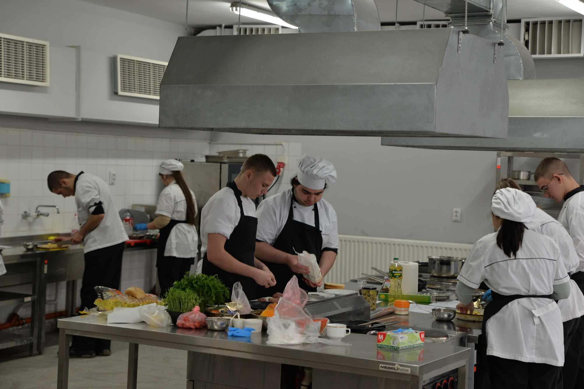Учениците със специални образователни потребности Илиян Планинцов и Тедислав Богойчев от XI клас в професионалната гимназия, като част от групата по учебна практика, приготвят аламинута „Бифтек с яйце“, а през това време учениците от обучаемата група правят филе „Вретено“, турнедо „Росини“ и „Медальон с гъби“.