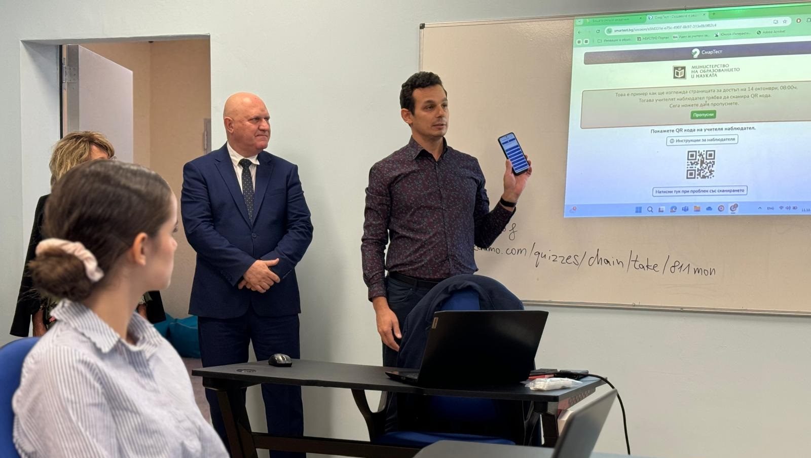 Служебният министър на образованието и науката проф. Галин Цоков провери на 11 октомври готовността за предстоящата проверка във великотърновската Професионална гимназия по строителство, архитектура и геодезия „Ангел Попов“. Екипът на училището показа как учениците влизат в платформите, времето и начина за решаване на задачите, както и за предаване на готовите работи.