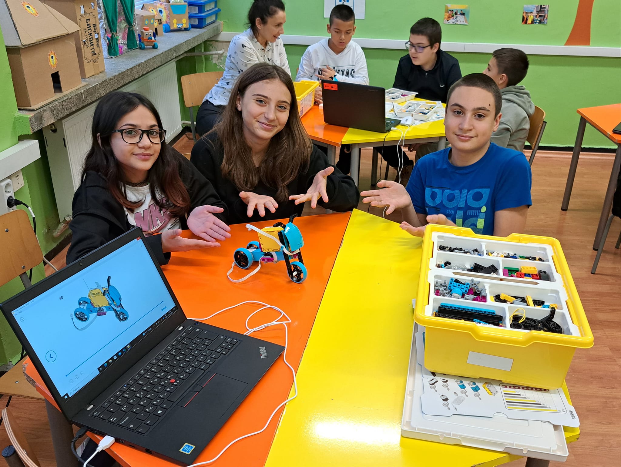 както и още 10 обучени специалисти, които работят с останалите деца в заниманията по интереси по роботика.