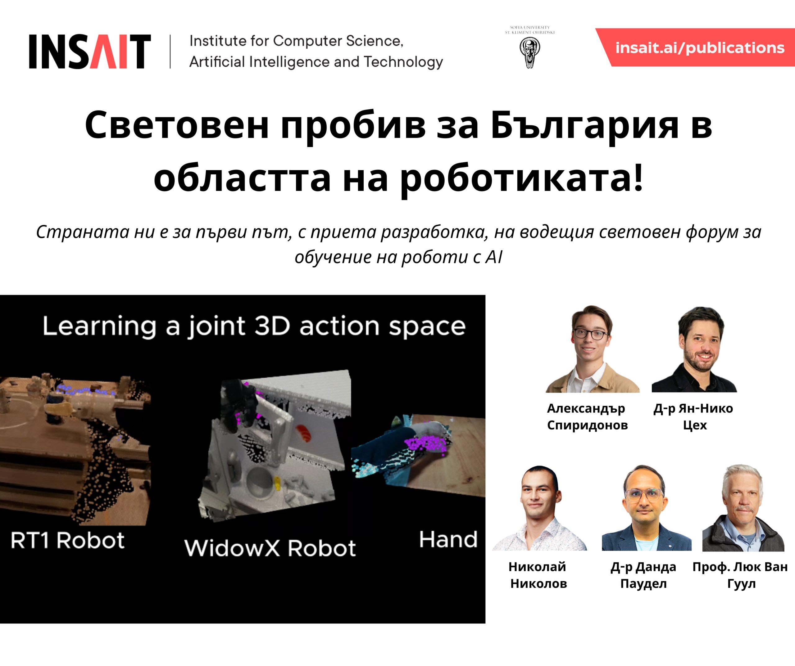 За първи път в историята на българската наука изследване, разработено в Института за компютърни науки, изкуствен интелект и технологии (INSAIT) към Софийския университет „Св. Климент Охридски“, е прието и ще бъде представено на Conference on Robot Learning 2025 (CoRL) – водеща световна конференция за роботика, която се провежда от 27 до 30 септември в Сеул, Южна Корея. Това съобщават от българската научна институция.
