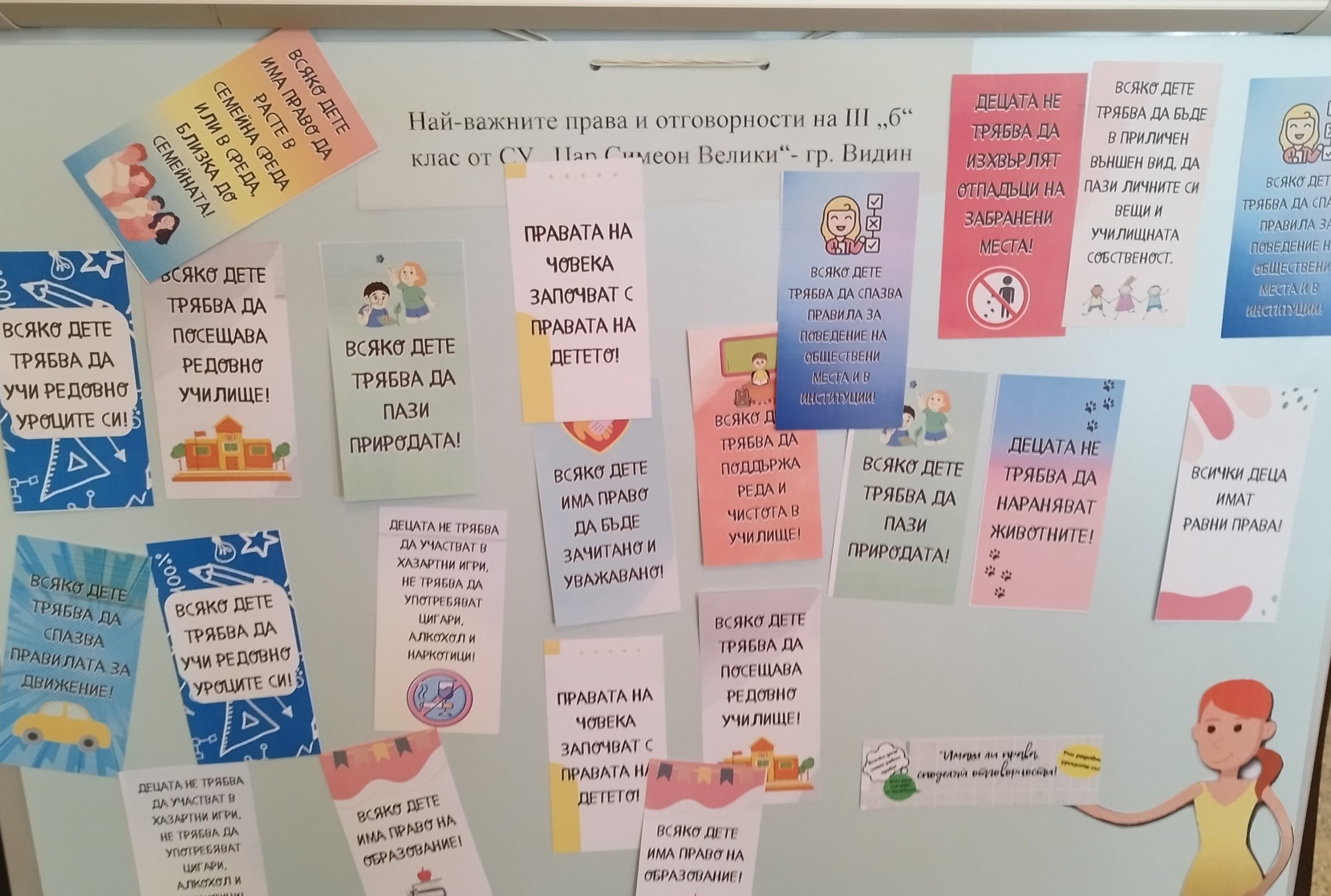 като отговаряха вярно на всички въпроси и участваха с много ентусиазъм. В края на срещата третокласниците създадоха общ плакат „Най-важните права и отговорности на IIIБ клас“, с който обобщиха наученото и показаха, че познават своите права, но и осъзнават задълженията си.