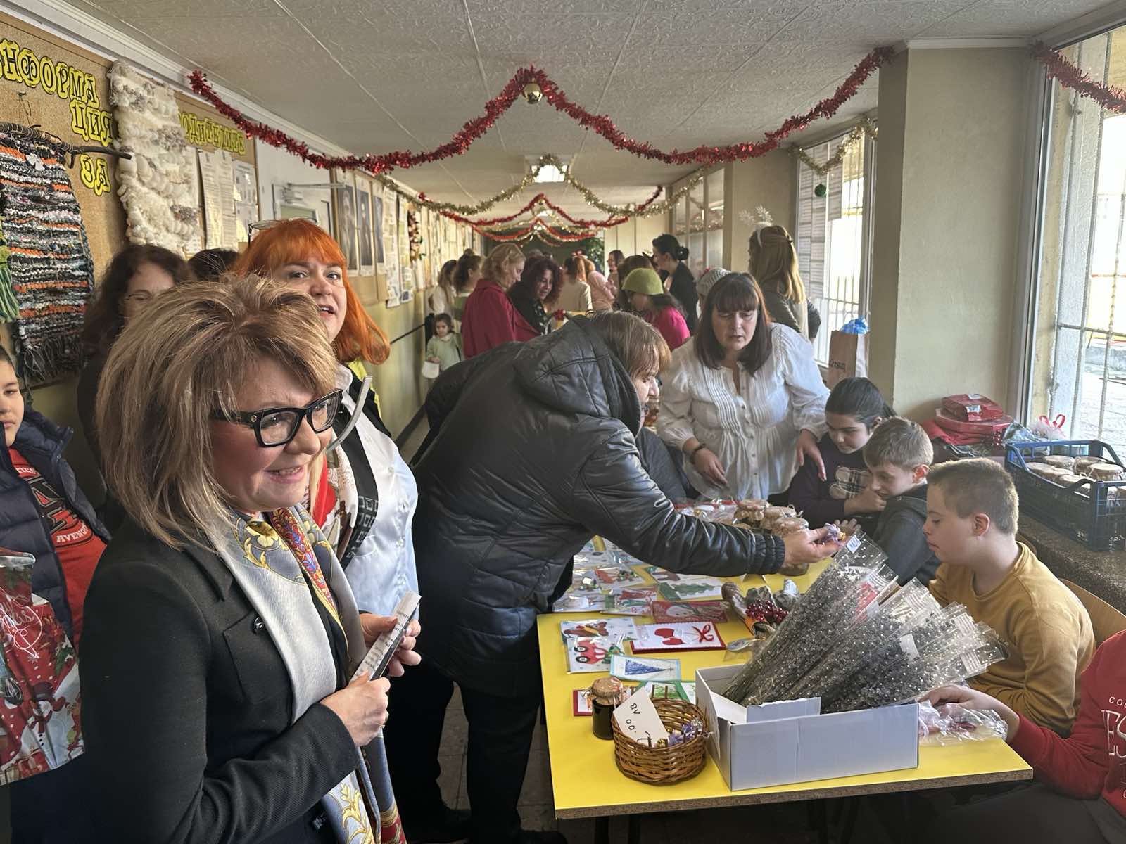 Заместник-министър Михалевска посети и коледния базар на училището, където ученици предлагаха ръчно изработени от тях изделия.