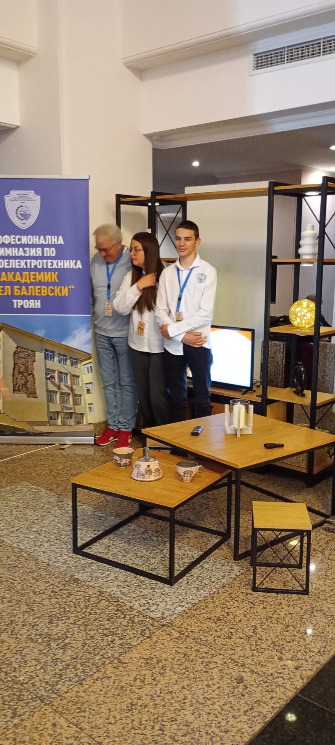 В категория „Мебели“ първото място печели отборът на Националната професионална гимназия по горско стопанство и дървообработване „Сава Младенов“ в Тетевен, който представя комбиниране мебел за малки пространства, включваща скрин с място за книги и подвижен плот, който го превръща в бюро.