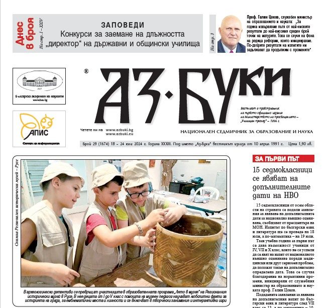 <h4><img class="size-medium wp-image-130719 alignleft" src="https://azbuki.bg/wp-content/uploads/2024/07/azbuki-29-2024-212x300.jpg" alt="" width="212" height="300" />Четете в новия брой:</h4> - Нови 481 конкурса за директори: Документи ще се приемат от 18 юли до 19 август в регионалните управления на образованието и онлайн - За първи път: 15 седмокласници се явяват на допълнителните дати на НВО - 521 школа с договори за STEM кабинети - Всички 2245 проектни предложения по процедурата вече са оценени - Отново пълен комплект медали от Международната олимпиада по биология - Добрите резултати задължават - Реформите трябва да продължат, заяви министър Галин Цоков пред началниците на РУО - За днешните деца Бай Ганьо не е антигерой: Проблемът е в смяната на ценности, казва Петя Димитрова, учител по БЕЛ в СУ „Христо Ботев“ в Кубрат - Най-красивата абитуриентка за 2024 г. Рая Методиева: Моето поколение е амбициозно - У всяко дете се крие изследовател: Регионалната библиотека „Гео Милев“ в Монтана със забавно лято за малките читатели <a class="fp-embed" style="max-width: 100%;" href="https://73fc06f9.flowpaper.com/292024/" data-fp-width="400px" data-fp-height="300px">в. Аз-буки, бр. 29/ 2024</a><script async defer src="https://cdn-online.flowpaper.com/zine/3.8.3/js/embed.min.js"></script> <a href="https://azbuki.bg/wp-content/uploads/2024/newspaper/%D0%B2.%20%D0%90%D0%B7-%D0%B1%D1%83%D0%BA%D0%B8%2C%20%D0%B1%D1%80.%2028%2C%202024.pdf" target="_blank" rel="noopener">Изтеглете </a>броя на вашeто устройство.