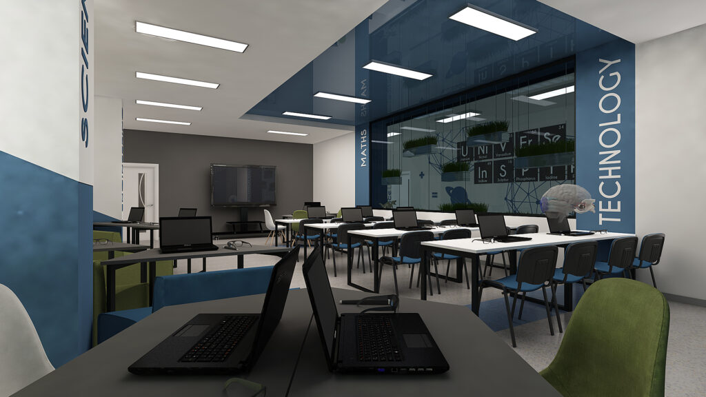 • изграждане на интерактивно фронтално учебно пространство (чрез интерактивни дисплеи) за по-добро визуално представяне на теоретичното съдържание по нов и интересен начин (чрез мултимедия и 3D сцени), което да е структурирано основно дисциплинарно;