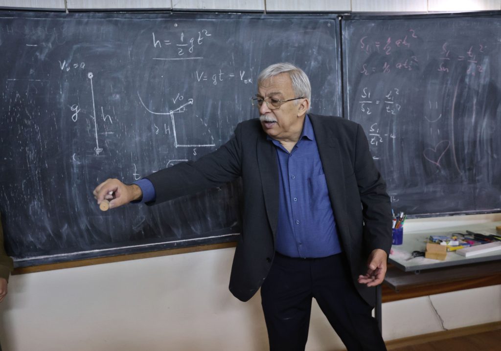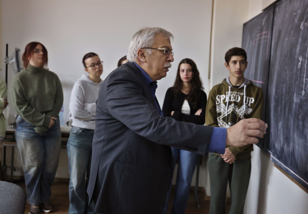 Намираме доц. Цветан Велинов пред черната дъска, заобиколен от ученици. Те са от кръжока по експериментална физика към Лабораторията за обучение на учители и ученици.