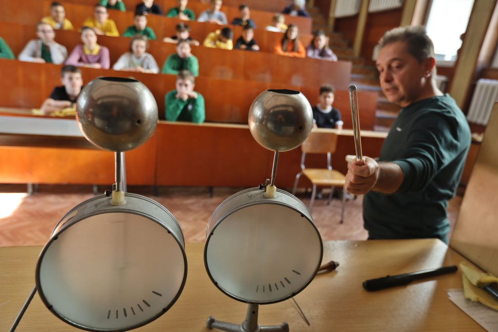 Оставяме кръжочниците да умуват върху формулите за скорост и надникваме в една от съседните зали. Там са ученици от 107. ОУ „Хан Крум“. Темата е електростатика. Преподавателят търка пръчка от смола с парче кожа и демонстрира как тя привлича леки частици. Пита коя е причината за това.