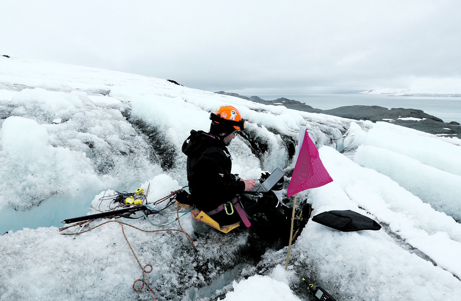 На снимката инж. Цветан Паров събира данни от поставените сензори в цепнатините на ледника Перуника.