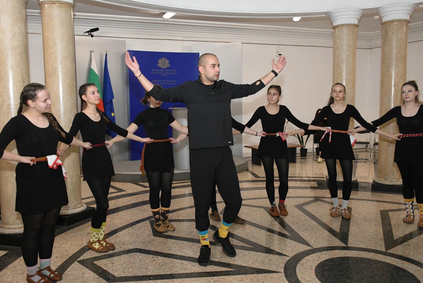 В урока за упражнение участваха седмокласници с разширена подготовка по хореография и дванадесетокласници с професия „Танцьор“ – български танци. Така те се включиха в инициативата на министъра на образованието и науката проф. Галин Цоков „Отворена класна стая в МОН“.