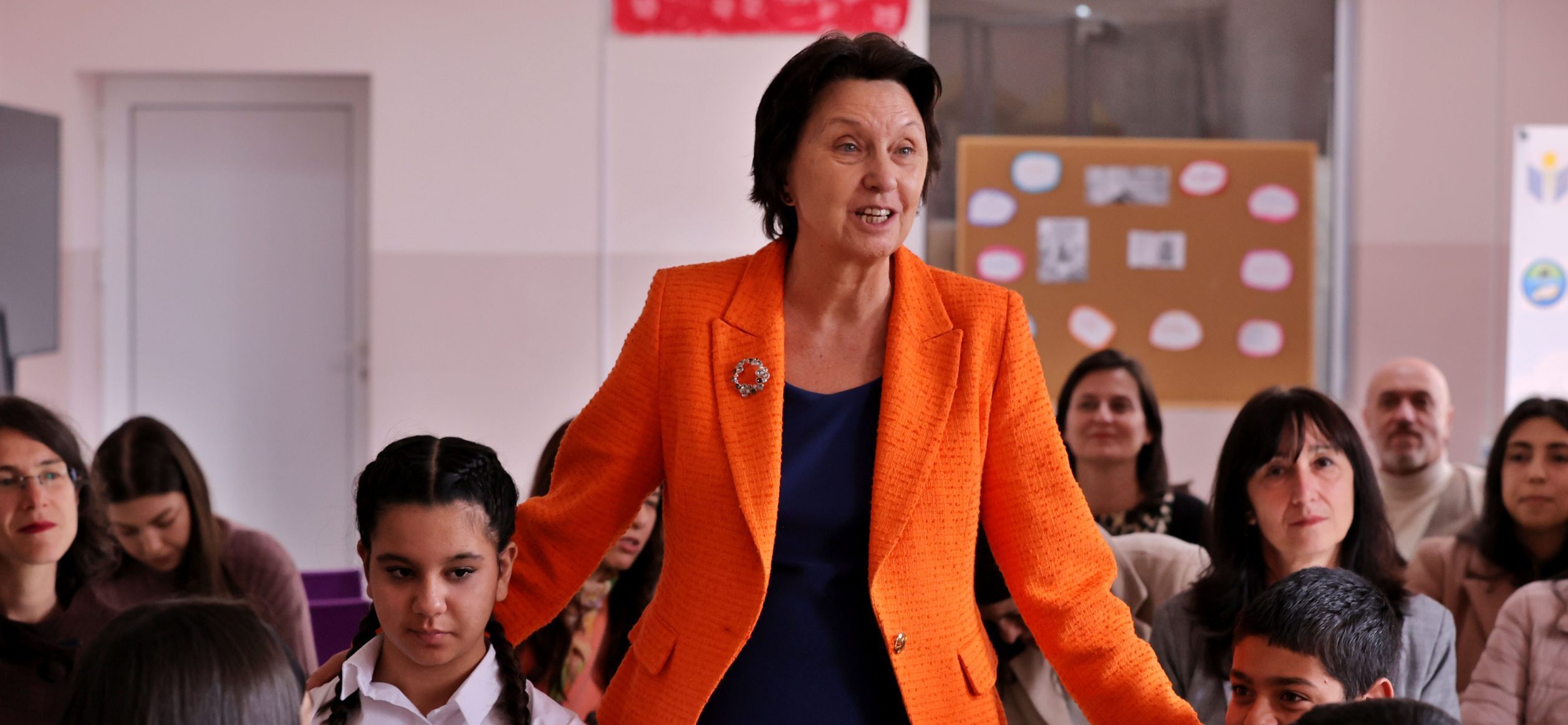 Зам.-министър Лазарова поздрави учениците и призна, че е възхитена от тяхното училище. Тя се обърна към тях и към директорката с молба да я приемат като доброволец. „Да идвам при вас и да разговаряме за различни проблеми, да ви помагам, да учим заедно. Тъй като аз също дълги години съм била учителка за мен ще бъде удоволствие“, каза тя.