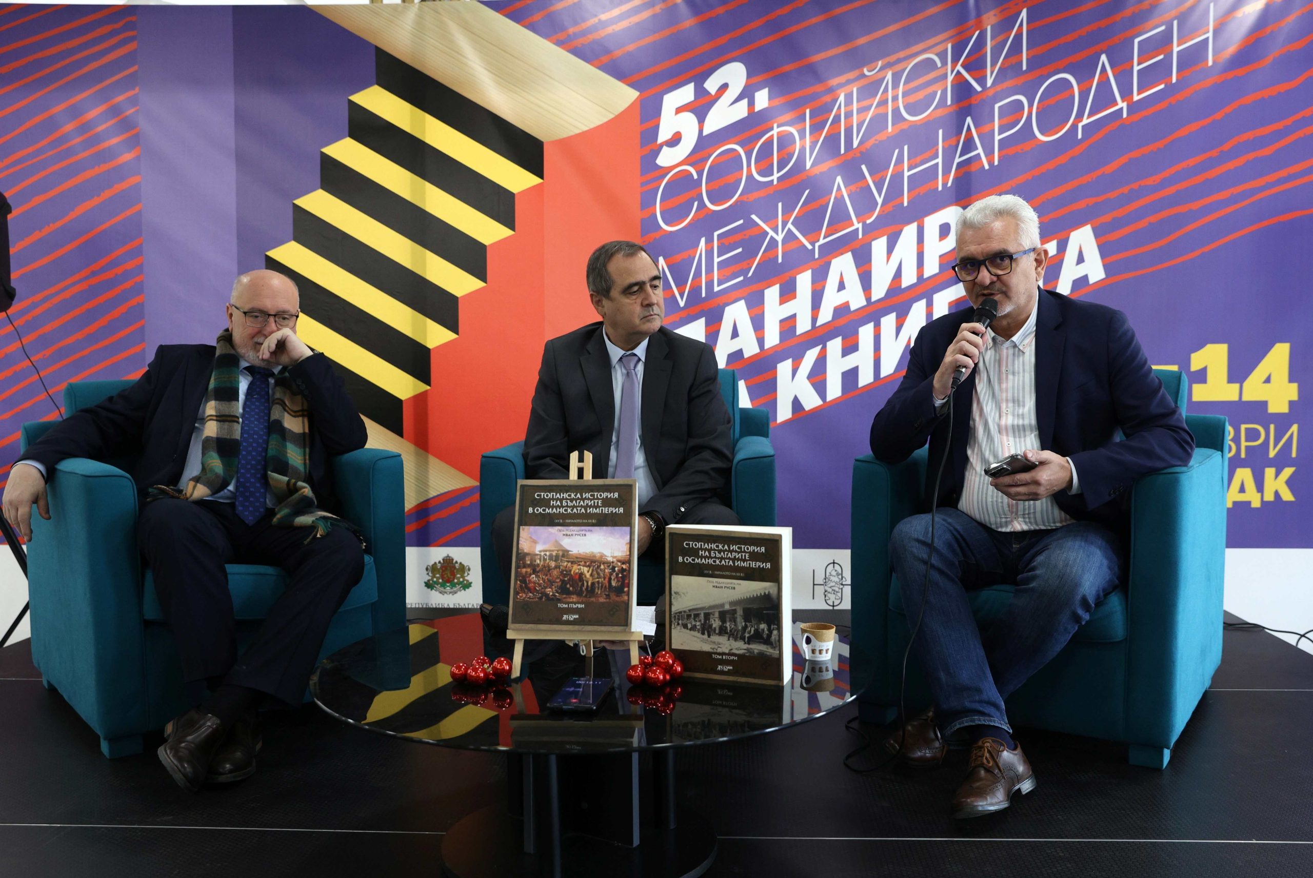 Проф. Милко Палангурски, проф. проф. Иван Русев и Емил Спахийски, директор на Национално издателство „Аз-буки“, на премиерата на „Стопанска история на българите в Османската империя“ (от ляво надясно)