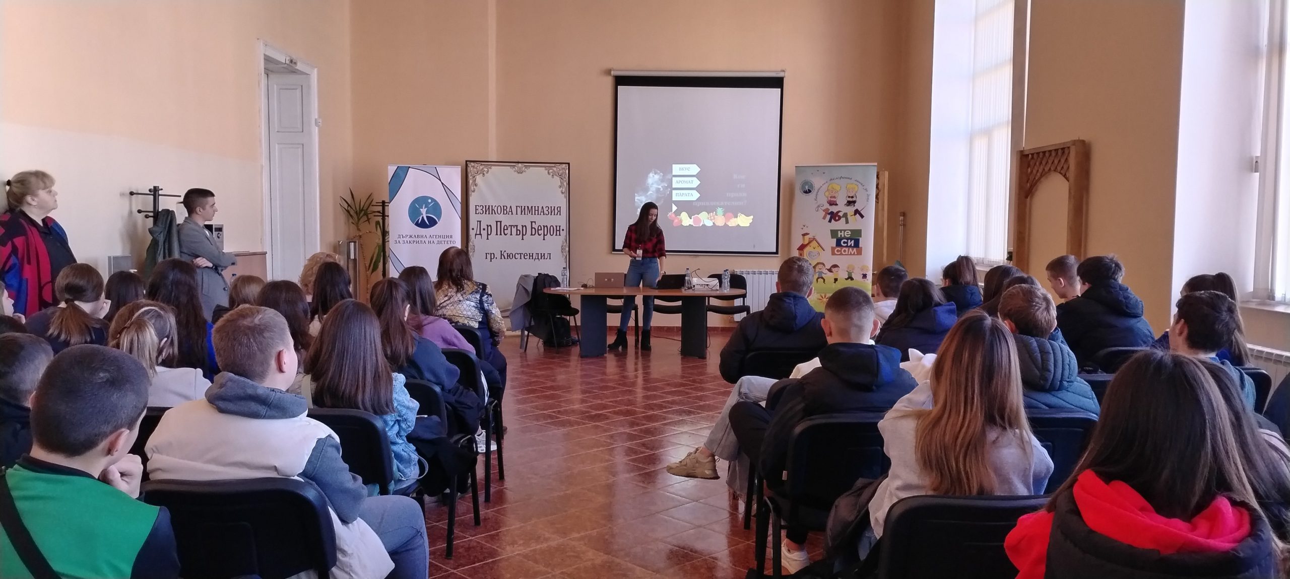 Председателят на Държавната агенция за закрила на детето д-р Теодора Иванова обсъди с ученици от Езиковата гимназия „Д-р Петър Берон“ – Кюстендил, вредите от употребата на вейпове, райски газ и т.нар. „дизайнерска дрога“. В разговора се включи и Кристина Ангелова от Регионалната здравна инспекция – Кюстендил.