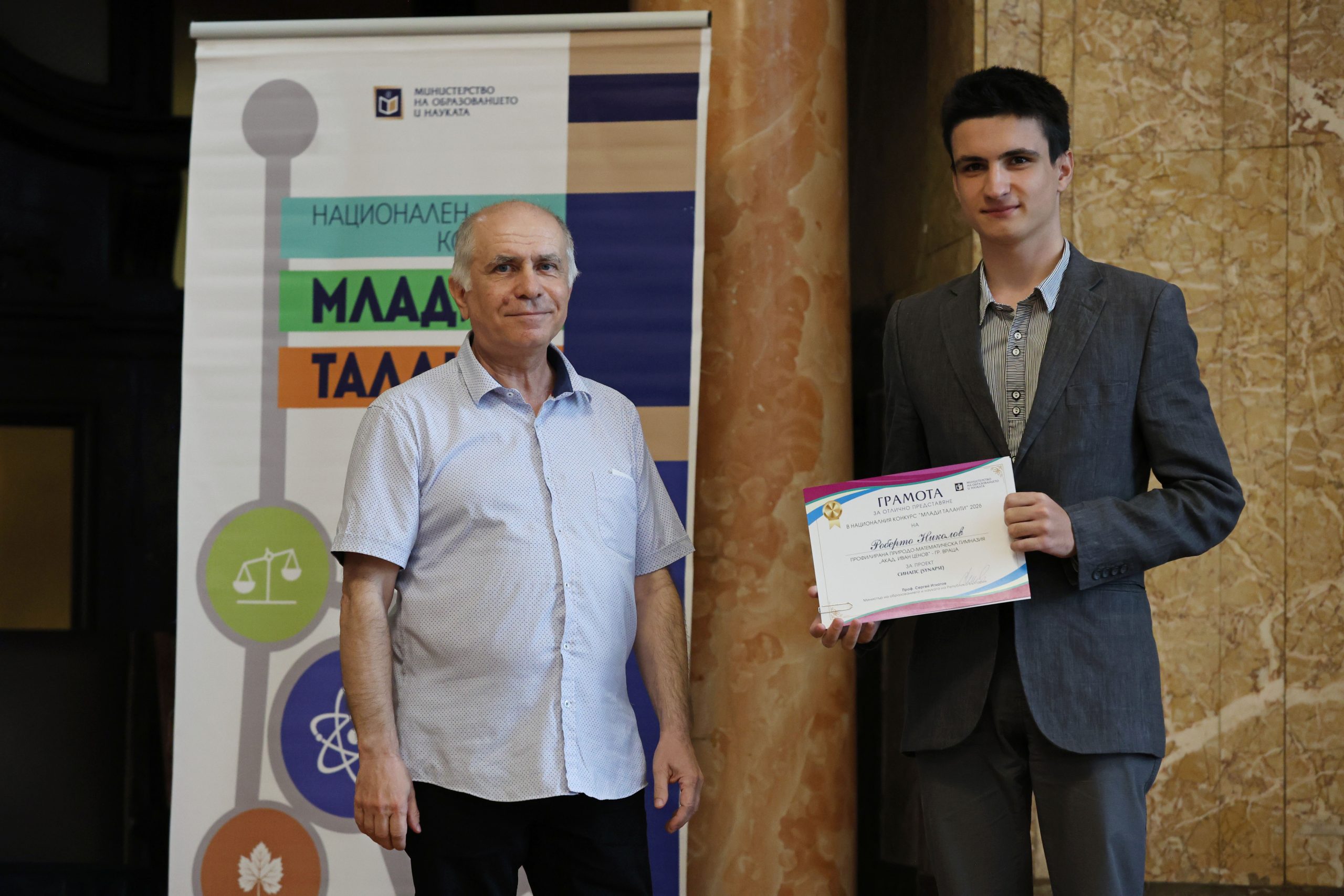 С проекта си „Синапс“ Роберто Николов от Профилираната природо-математическа гимназия „Акад. Иван Ценов“ във Враца получи възможност за участие в Лятната изследователска школа по математика и информатика на Ученическия институт по математика и информатика към БАН. Наградата му бе връчена от директора на Института по математика и информатика чл.-кор. Петър Бойваленков.