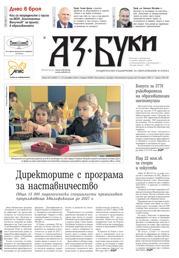 <h4><a href="https://azbuki.bg/wp-content/uploads/2024/11/screenshot-2024-11-07-110203.jpg"><img class="size-medium wp-image-136822 alignleft" src="https://azbuki.bg/wp-content/uploads/2024/11/screenshot-2024-11-07-110203-208x300.jpg" alt="" width="208" height="300" /></a>Четете в новия брой:</h4> - Директорите с програма за наставничество - Общо 15 000 педагогически специалисти преминават продължаваща квалификация до 2027 г. - Дигитална карта на научни лаборатории: Звената са част от изградените центрове за върхови постижения и центрове за компетентност - Аз ще бъда отговорен шофьор: Министър Галин Цоков откри кампанията на МОН за безопасно движение - Фантастичните умове на България: Изложба представя постиженията на страната ни в международните олимпиади по науки през 2024 г. - Връчиха наградите „Константин Величков“ - Час по Лудогорие: Учениците от начален етап в разградското ОУ „Н. Й. Вапцаров“ надникват в раклата на баба и учат за традициите в родния си край - 25 билета до ЦЕРН, моля - Цял клас в НПМГ и неговата ръководителка сами си организират посещение в научния център - Учене от съвместния опит: Регионалното управление на образованието в София-област организира три майсторски класа за директори и учители - Предлагат научна програма „Море“: Разработва се проект за създаване на Център за морски науки, казва служебният министър на околната среда и водите Петър Димитров - Проф. д.н. Емануел Мутафов: По-себичното общество неглижира грамотността - Бъдещи дипломати разговарят за Европа: Студенти от България, Франция, Германия и Северна Македония провеждат в четири града лекции, дискусии и теренни изследвания за ЕС и неговото бъдеще <a class="fp-embed" style="max-width: 100%;" href="https://73fc06f9.flowpaper.com/452024/" data-fp-width="400px" data-fp-height="300px">вестник Аз-буки 45/2024</a><script async defer src="https://cdn-online.flowpaper.com/zine/3.8.3/js/embed.min.js"></script> <a href="https://azbuki.bg/wp-content/uploads/2024/newspaper/%D0%B2.%20%D0%90%D0%B7-%D0%B1%D1%83%D0%BA%D0%B8%2C%20%D0%B1%D1%80.%2045%2C%202024.pdf" target="_blank" rel="noopener">Изтеглете</a> броя на вашeто устройство.