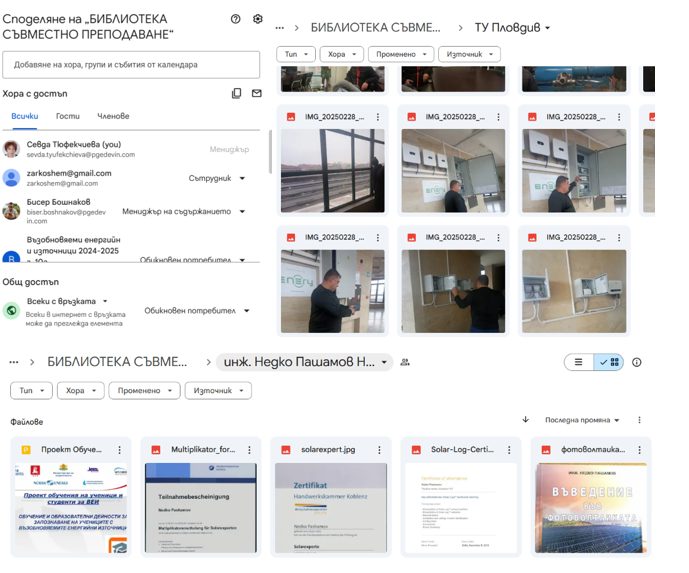 Създадена е съвместна библиотека, в която са включени учебни материали от учители в ПГЕ „А. С. Попов“, водещи фирми в областта на соларните системи и ТУ София – Филиал Пловдив. Библиотеката е изградена с облачна технология. Създадени са екипи от учители и ученици с различно ниво на достъп и съвместни дейности в споделена дигитална среда. Проведени са лекции и консултации от външни лектори в областта на зелената енергия. Съвместното преподаване в училище се осъществява от трима учители, специалисти в област техника – инженер по електротехника, машинен инженер и инженер по автоматизация, като всеки от тях провежда консултации и насочва учениците при реализиране на проектните дейности.