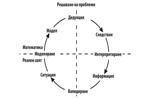 Той разделя в едно измерение математиката и реалността, а в другото измерение разграничава еднакво проблема и решението. В измерението на проблема наличната информация се възприема, валидира в ситуация, като тя е предварително структуриран математически проблем или математически проблем, свързан с реалния живот. Чрез моделирането се изгражда модел, като в мисловен план се извършват анализ, синтез, абстрахиране, обобщение и дедукция. Извежда се следствието и всеки резултат се интерпретира.