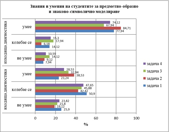 Резултатите от емпиричното изследване са систематизирани и анализирани чрез математико-статистически методи за обработка на данни. При входящата диагностика при всички задачи студентите, които са се колебаели, са в диапазона от 42,42% до 50,9%. Най-много грешки са допуснали при задача 4. – 25,9% от тях не са успели да съставят модела или да опишат вярно методическата работа при съставяне на спомагателен модел – чертеж. При задача 3 резултатите им са най-високи – 38,53% от тях са работили вярно. При изходящата диагностика се установява повишаване равнището на резултатите, като се увеличава процентът на студентите, които вярно работят по всички задачи – в диапазона от 67,94% до 84,71%. Намалява броят на студентите, които работят грешно, и те са от 7,94% до 23,82%. Най-високи резултати са при задачите, свързани с предметно-образното моделиране.